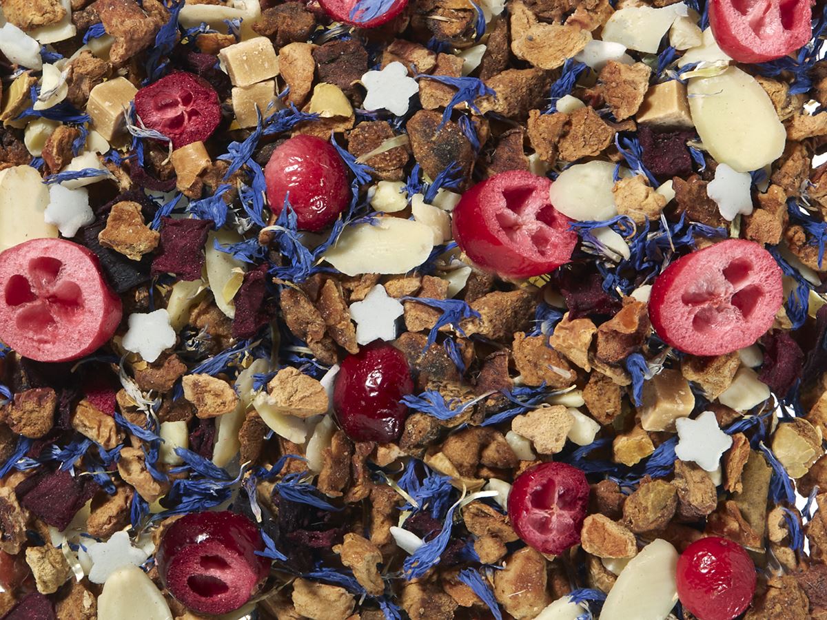 apple pieces, almond pieces, cream-caramel pieces, sliced almonds, freeze-dried cranberry slices, white sugar stars, beetroot, flavoring, cornflowers.